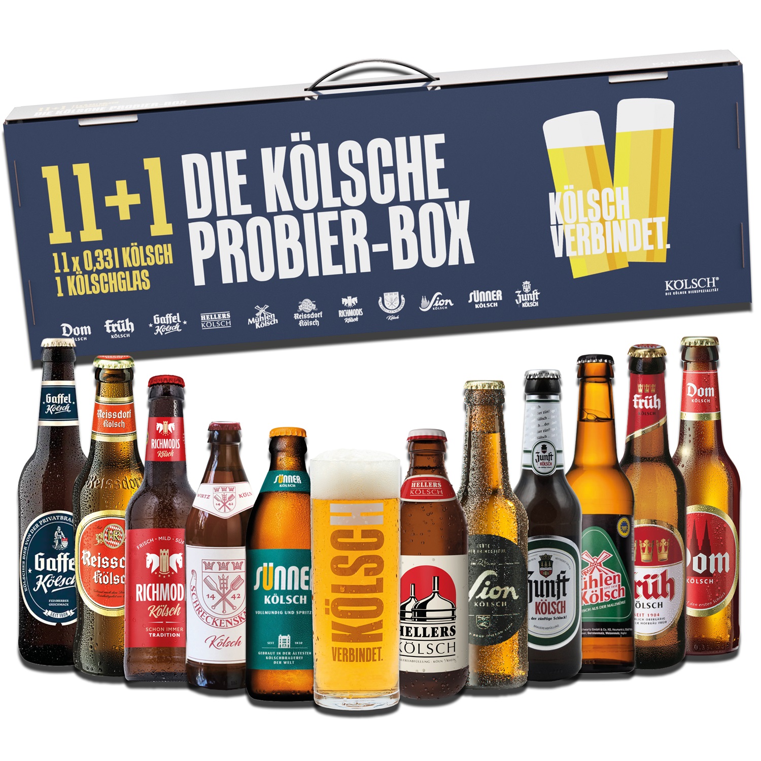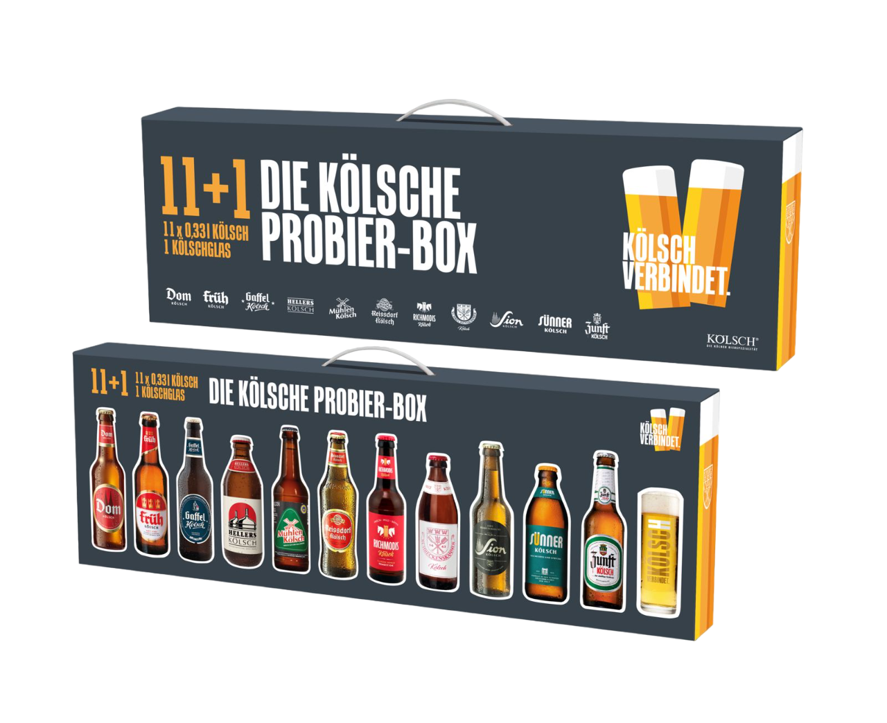 Die Kölsch-Box enthält 11 selten zusammengestellte Kölsch-Sorten, die selbst in Köln kaum alle in einem Markt zu finden sind. Jedes Kölsch schmeckt überraschend unterschiedlich – auch wenn es nur in Köln (mit Ausnahme von Zunft Kölsch) gebraut werden darf. Mit der beiliegenden Kölsch-Stange und dem Bewertungsfolder findet ihr ganz einfach euren persönlichen Favoriten.